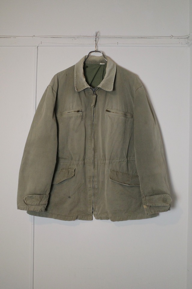 1960年代フランス軍で使用されていたメカニックジャケット。 ハの字ECLAIRジップの経年のゴールドが鈍く光っていて渋いですね。 ジップ型のジャケットは中々出回らないので、サイズが合う方には是非オススメです。 袖丈と着丈がリサイズされており、かなり短めになっております。 〈size〉 肩幅:48cm 身幅:55cm 袖丈:45cm 着丈:63cm 日本サイズで言うMサイズ程度ですが、袖丈が少し短めです。 〈condition〉 ダメージ特にダメージ汚れなく良好です。 リサイズされております。 −−−−−−−−−−−−−−−−−−−−−−−−−−−−−−−−−− イメージと違うなどの理由での返品は行っておりません。 採寸に関して、細心の注意をはらい計測しておりますが、多少誤差が生じる可能性があります。 神経質な方のご購入はご遠慮ください。 古着屋ヴィンテージにご理解の上、ご購入をお願いいたします。 −−−−−−−−−−−−−−−−−−−−−−−−−−−−−−−−−−