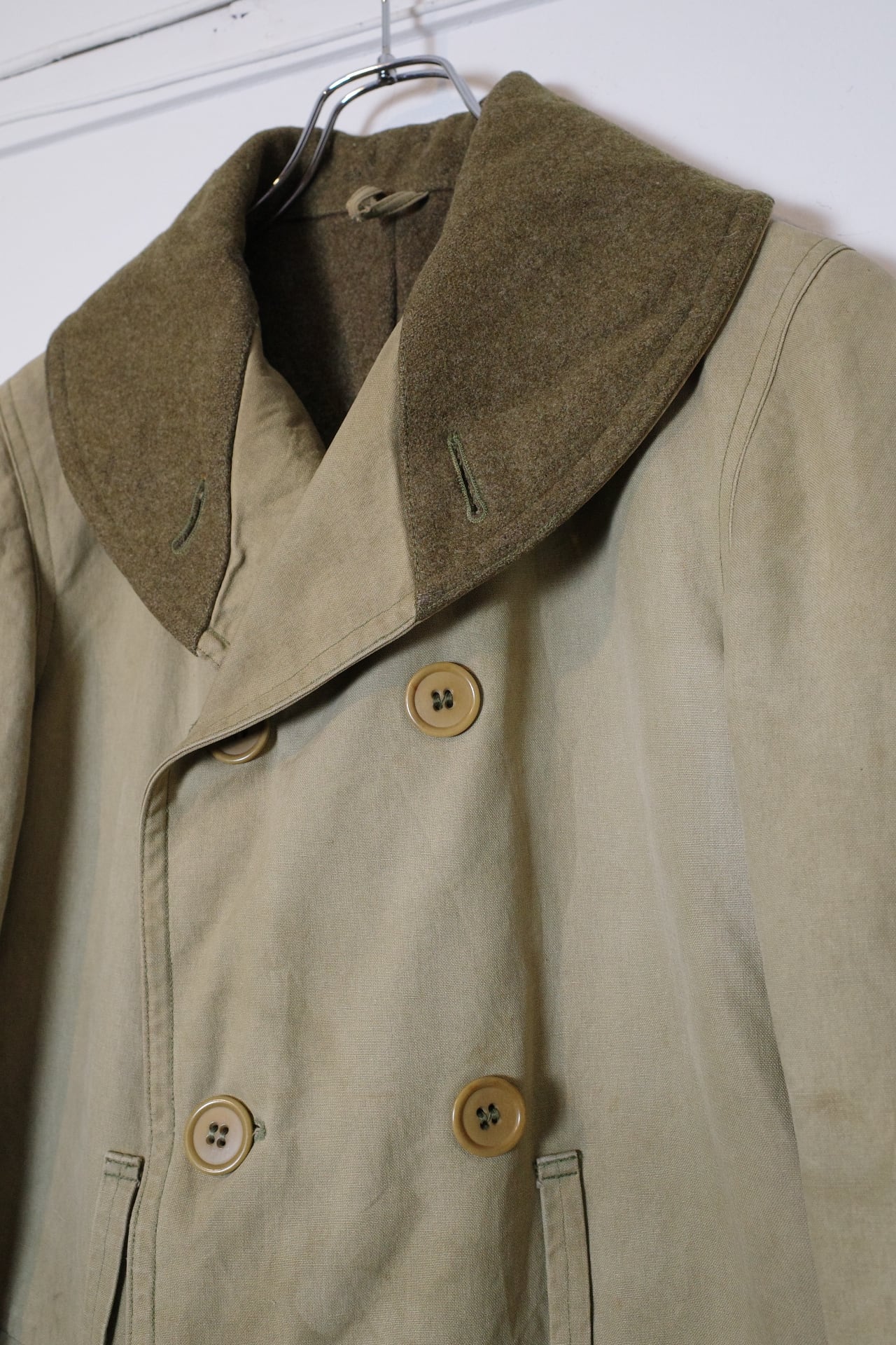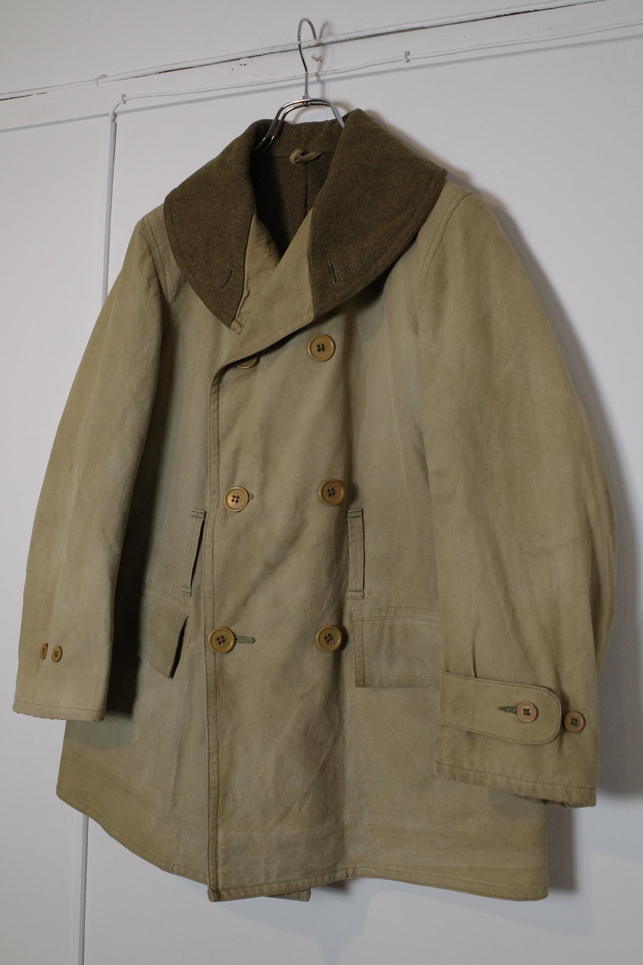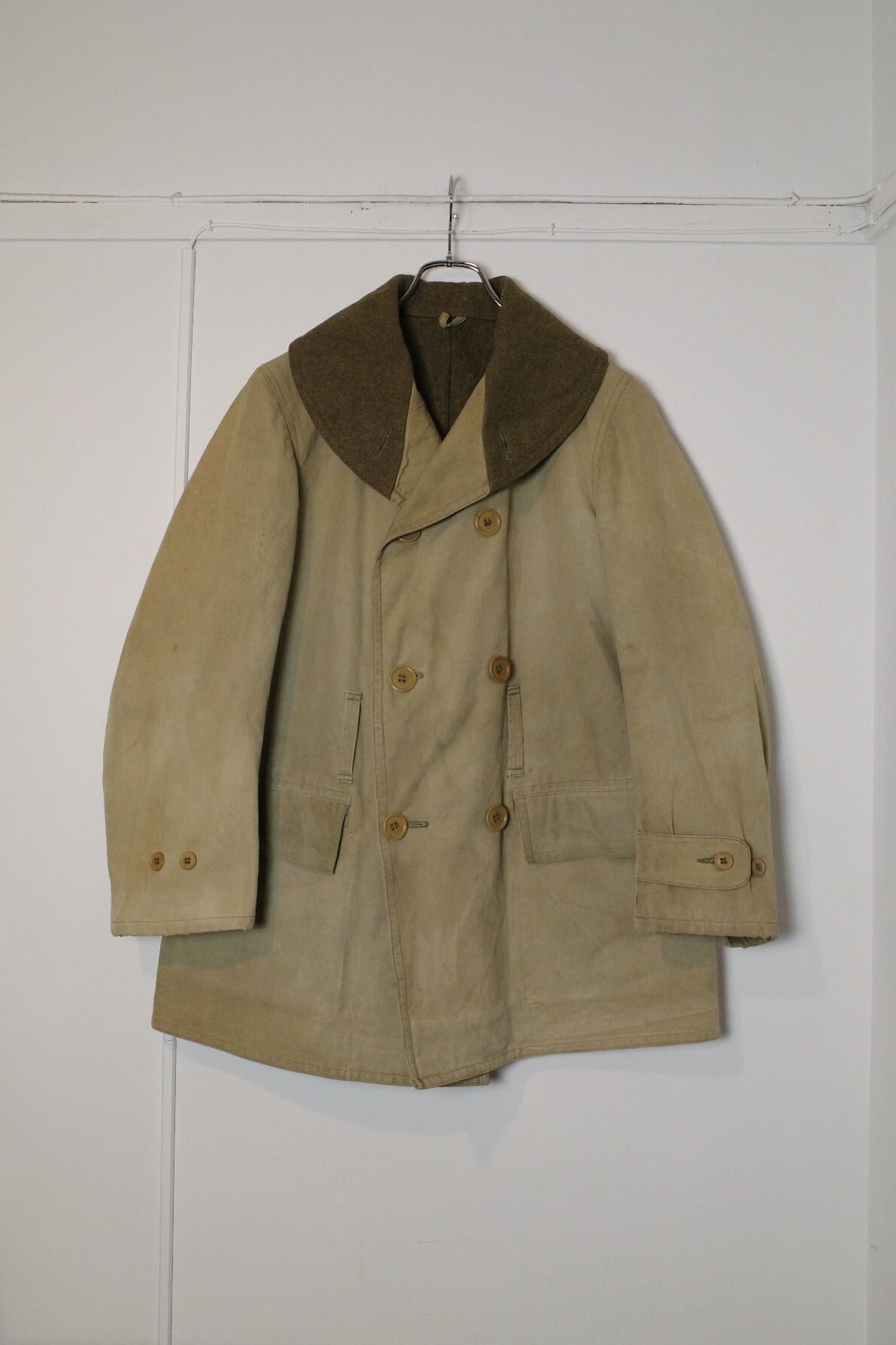お好きな方の多いダブルブレストで表地はキャンバス地で、裏にウールが貼られており、当時のアメリカの屈強さが伺える男らしいアウターです。